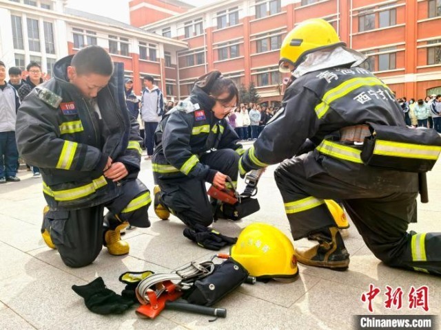 3月1日,在青海省西宁市第一私立高级中学内,西宁市城中区消防救援大队防火监督参谋陈婷正在向学生们讲解消防安全知识,学生们纷纷抢答并争相体验各类消防器材。