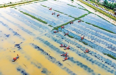 五月十日,在江西省吉安市吉水县盘谷镇万亩稻渔产业基地,虾农划船捕捞小龙虾。