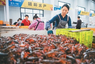 近日,工作人员在湖北省潜江市中国小龙虾交易中心分拣小龙虾。