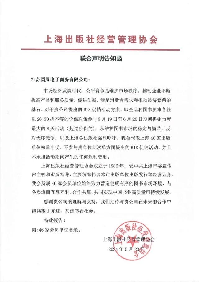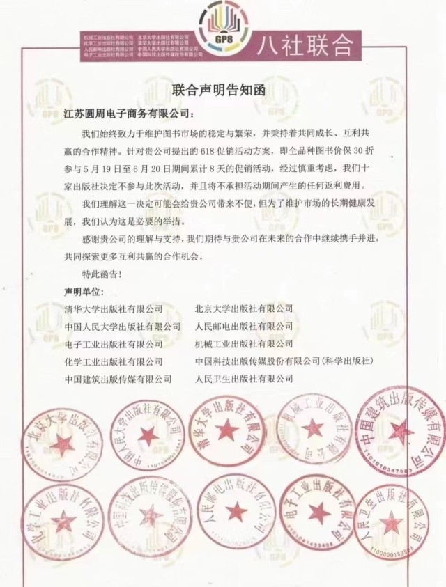 在今年618开始前,两份出版行业发出的“联合声明告知函”在互联网上流传。两份告知函分别由北京8家出版社和上海出版经营管理协会代表上海46家出版单位发出,申明不参加江苏圆周电子商务有限公司提出的618促销活动方案。