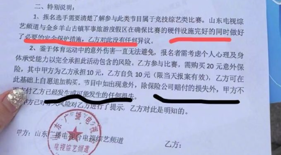 报名选手需要清楚了解参与此类节目属于竞技综艺类比赛。节目组与景区在确保比赛的硬件设施完好的同时做好了必要的安全保护措施,乙方对此没有任何异议。