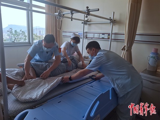 6月28日,福建省泉州市第一医院神经外科病房,护理员正在给患者叩背。