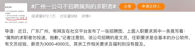 近日,广东广州一公司进行招聘,入职要求其中一条竟写着:“属狗的求职者勿投递,抱歉。”