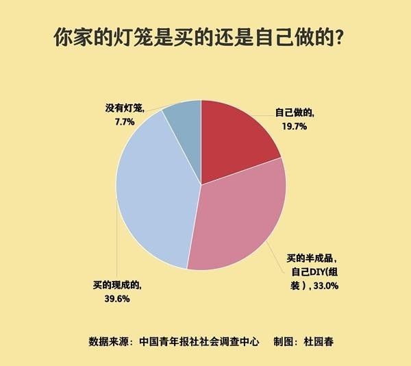 在全国不少地方,元宵节都会赏花灯、猜灯谜,许多人家也会在元宵节这天,在家中准备灯笼。今年元宵节,你家准备灯笼了吗?日前,中国青年报社社会调查中心联合问卷网(wenjuan.com),对1342名受访者进行的一项调查显示,超半数受访者表示今年元宵节家中的灯笼是自己动手做的,其中,19.7%的受访者完全是自己做的,还有33.0%的受访者买了半成品自己组装。