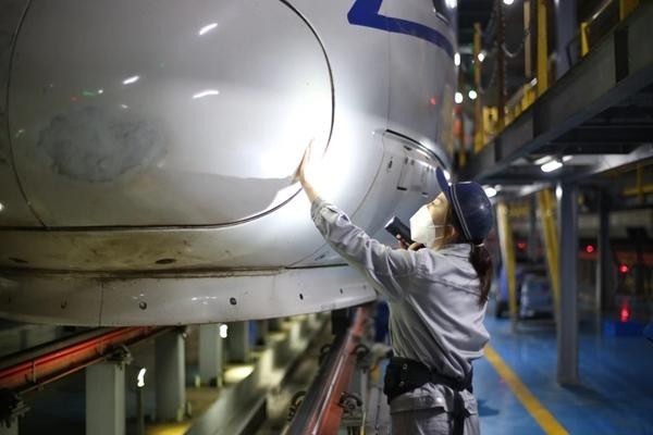 “雪绒花”班组副工长徐雨欣带中青报·中青网记者参观车间。穿过一个又一个下沉式通道,记者来到动车组面前,车辆下部两侧设备盖板已全部打开。徐雨欣说,她们要拿着手电筒检查设备是否有裂纹、漏油、弯曲等情况。之后,要进入检修坑道,检查车轮等部件是否有问题。