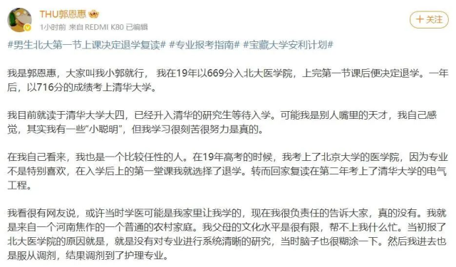 近日,河南小伙郭恩惠“从北大退学一年后考上清华”的经历引发关注。