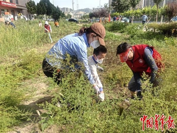 9月10日,兰州热心市民参与蒿草清除志愿服务活动。中青报·中青网记者 王豪/摄
