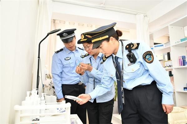 2024年10月10日,安徽省阜阳市阜南县卫生执法人员、公安民警和市场监督执法人员对某生活美容机构进行检查。视觉中国供图(资料图片)