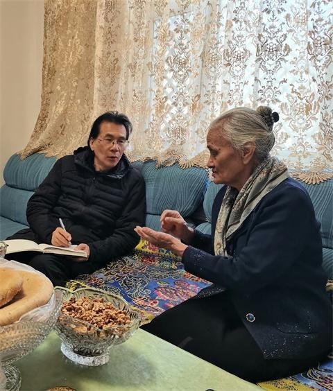 2025年春天,何建明采访78岁的葡萄种植专家海力其汗·玉素甫。受访者供图