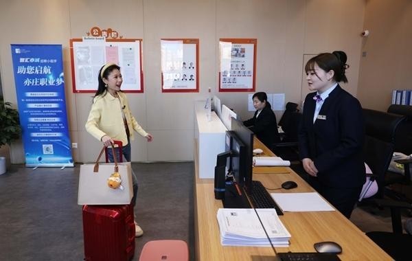 3月12日,北京亦庄大学生住宿保障项目迎来首批入住应届大学生。图为一名年轻人在办理入住手续。视觉中国供图