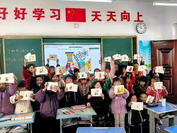 远程支教课上,孩子们展示完成的美术作品。受访者供图