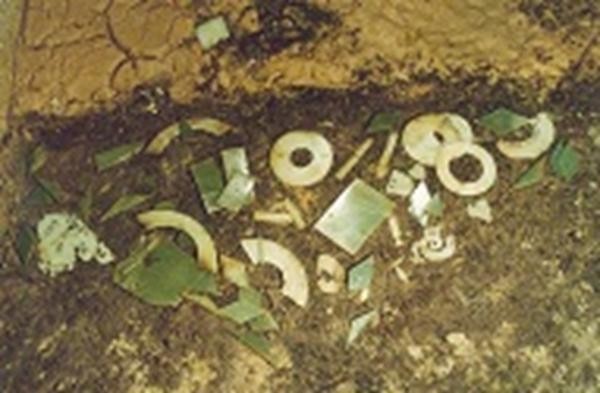 狮子山西汉楚王陵地宫主墓室地面一角,清除淤土后暴露的玉器。