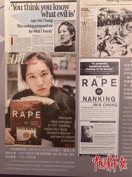 张纯如纪念馆墙上展示的张纯如和《南京大屠杀》登上各大新闻媒体。中青报·中青网记者 马宇平/摄