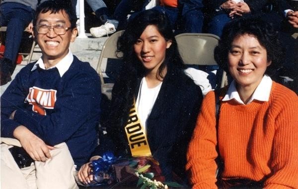 1988年美国伊利诺伊大学校友返校节活动,入选“返校节公主”的张纯如(中)与父母。张纯如纪念馆供图