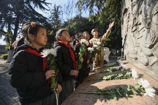 12月6日,安徽省合肥市庐阳区杏花村街道武装部联合红星路小学开展“铭记历史 勿忘国耻”主题纪念活动。在拱辰桥死难者纪念碑前,一位民兵向小学生讲述抗战历史。视觉中国供图