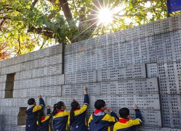 11月30日,南京大屠杀死难者家庭祭告活动在侵华日军南京大屠杀遇难同胞纪念馆举行。青少年代表为“哭墙”上的遇难者名字描新。视觉中国供图