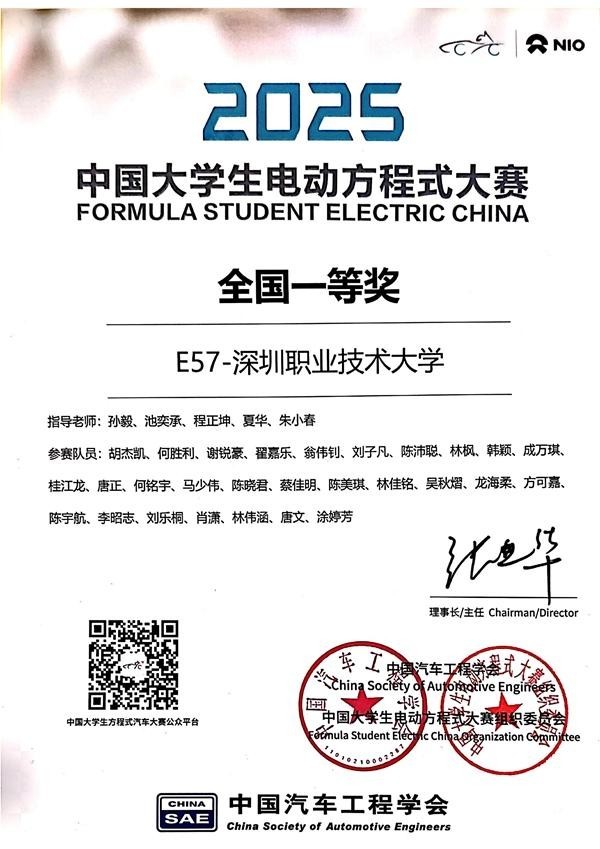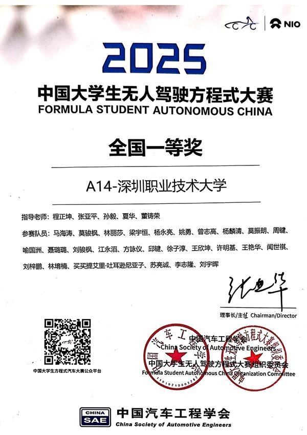 这是一个与985、211高校同台竞技的舞台。决赛过后,深职大魅影方程式赛车队自主研发的两款赛车——E57电动方程式赛车和A14无人驾驶方程式赛车双双荣获“全国一等奖”。在电动车一等奖仅15席,无人车一等奖仅4席的激烈角逐中,深职大与吉林大学、同济大学这样的传统强队并排站在了一起。
