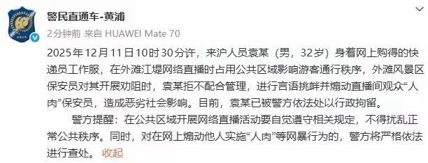 2025年12月11日10时30分许,网民袁某(男,32岁)身着网上购得的快递员工作服,在上海外滩江堤网络直播时占用公共区域影响游客通行秩序,外滩风景区保安员对其开展劝阻时,袁某拒不配合管理,进行言语挑衅并煽动直播间观众“人肉”保安员,造成恶劣社会影响。