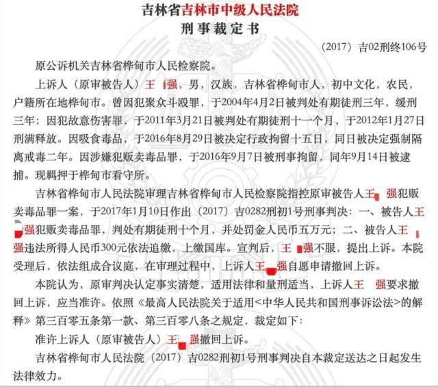 2017年1月10日,吉林省桦甸市人民法院一审判决被告人王某强犯贩卖毒品罪,判处有期徒刑十个月并处罚金人民币五万元;被告人王某强违法所得人民币300元依法追缴,上缴国库。一审宣判后,王某强上诉至吉林省吉林市中级人民法院,后自愿申请撤回上诉。
