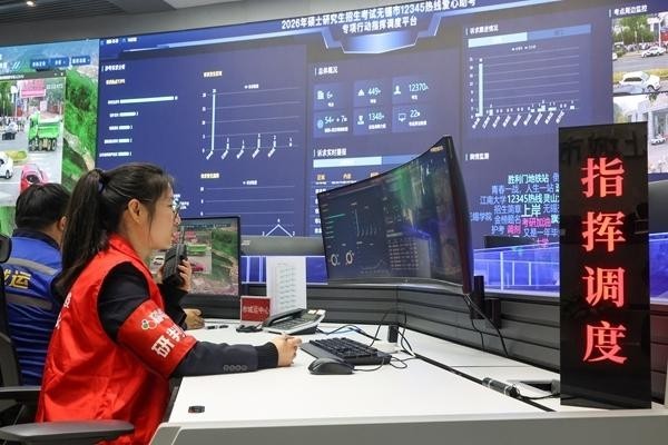 2025年12月20日,全国硕士研究生招生考试举行,江苏省无锡市相关部门工作人员通过12345热线爱心助考专项行动指挥调度平台,为考生保驾护航。视觉中国供图