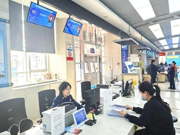 1月26日,宁夏回族自治区银川市永宁县政务服务中心消防窗口,消防文员刘彧畅(左)为办事群众服务。宁夏永宁县消防救援大队供图