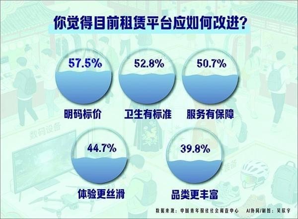 在“以租代买”的消费方式中,年轻人在获得便利的同时,也面临一些困扰。近日,中国青年报社社会调查中心联合问卷网(wenjuan.com)进行的一项有1334名青年参与的调查显示,44.3%的受访青年指出租赁的物品清洗不到位,卫生有隐忧,41.6%的受访青年认为租赁消费隐藏费用高。57.5%的受访青年期待租赁平台明码标价,减少复杂的优惠套餐,52.8%的受访青年期待出台清洁消毒标准。