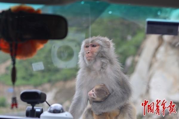 2024年8月,西藏自治区山南市。游客在219国道上偶遇野生猴群,停车观看时,带着幼崽的母猴爬上了汽车前窗。中青报·中青网记者 余冰玥/摄