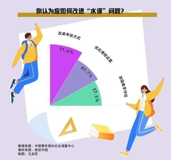 减少“水课”,71.6%的受访者期待改革考核方式,改善教师“重科研轻教学”现象;61.7%的受访者期待优化课程设置,增强实用性;57.5%的受访者建议加强教师教学评估,提高授课质量;25.5%的受访者建议增加学生的课程评价权重。