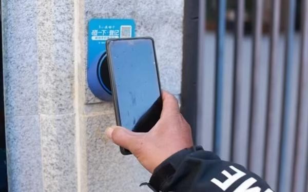 一名外卖骑手使用手机“碰一下”功能登记进入小区。北京市通州区人民检察院供图