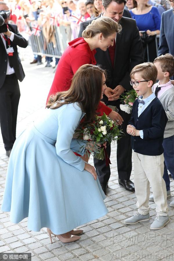 凯特王妃半蹲与小绅士聊天。