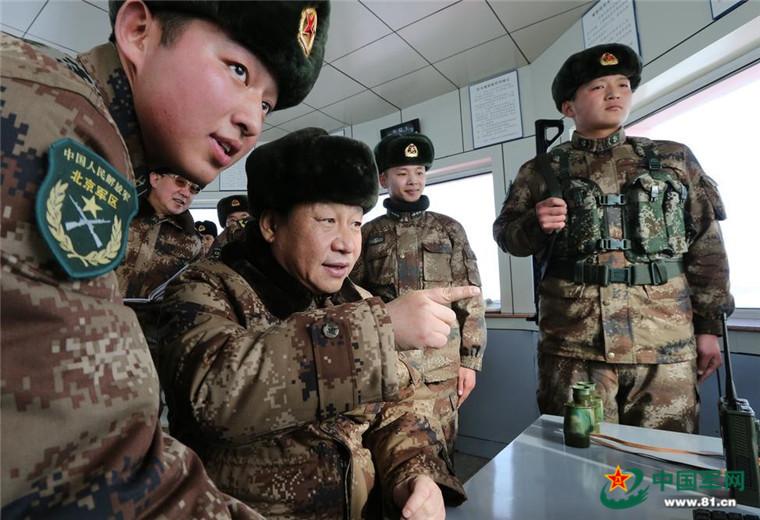 2014年1月26日,中共中央总书记、国家主席、中央军委主席习近平冒严寒踏冰雪,来到内蒙古军区某边防团三角山哨所,看望执勤的战士。解放军报记者周朝荣 摄