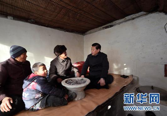 2012年12月29日至30日,习近平在河北省阜平县看望慰问困难群众。这是习近平在龙泉关镇骆驼湾村看望唐荣斌老人一家。(图片来源:新华社)