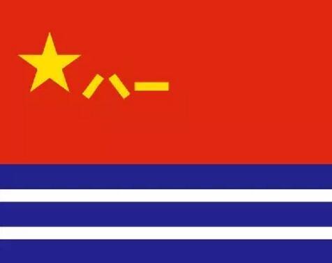 旗面上半部保持中国人民解放军军旗的基本样式,正红色旗面,上有金黄色五角星和“八一”字样;旗面下半部为横向的海蓝色和白色条纹相间。