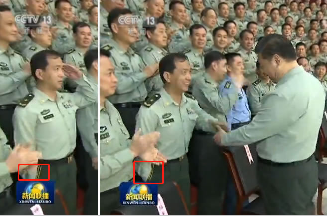 但经过这位时,代表先是静静站立,见习主席走到面前,马上举起左手敬礼,右臂却一直保持立正姿势并紧贴身体右侧。习主席则伸出左手和代表相握,并用右手轻拍代表手背三下,与此同时,向这位代表点头致意。