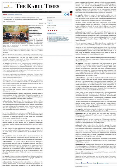 此外,我也想请阁下进一步做些宣介工作,让阿富汗新闻界、学术界、专业界更加重视对中国的研究。我到阿时间不长,发现阿富汗学术界重视对美欧、印度和俄罗斯的研究,而对中国研究的深度和广度还不够,中国问题专家不多。