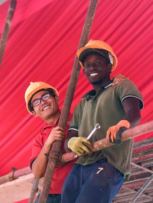 中塞工人并肩工作。(新华社记者燕雁摄)
