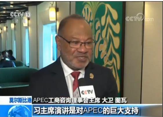 APEC工商咨询理事会主席大卫·图瓦 :“习主席演讲是对APEC的巨大支持,对我们理事会也是同样的,讲话完全都是和APEC需求相关的内容,包括(支持)国际自由贸易,这是各国间贸易的基础。”