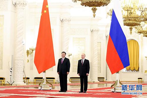 伴随着雄壮激昂的迎宾曲,习近平和普京分别从乔治大厅两端沿红地毯阔步迈入大厅中央。两国元首紧紧握手,合影留念。军乐团奏中俄两国国歌。习近平同俄方主要官员握手,普京同中方陪同人员握手。