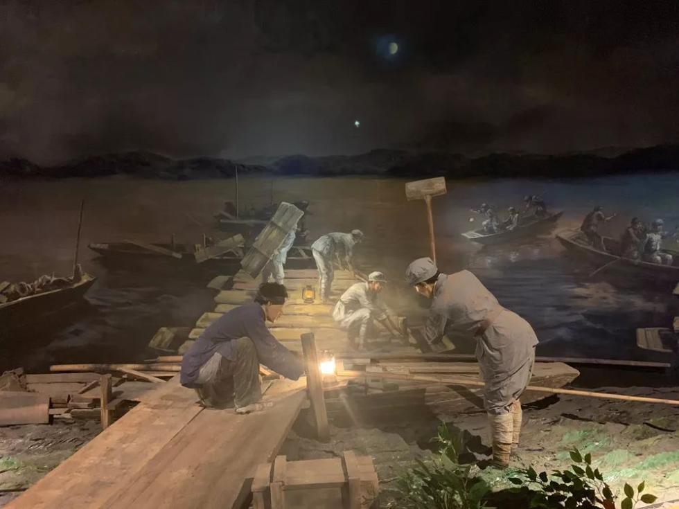 △中央红军长征出发纪念馆中再现了军民为避免敌机侦察被发现,在夜间搭建浮桥的场景