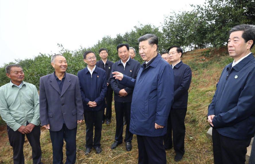 △2019年9月17日上午,习近平来到信阳市光山县槐店乡司马光油茶园,同正在劳作的村民和管理人员交流。