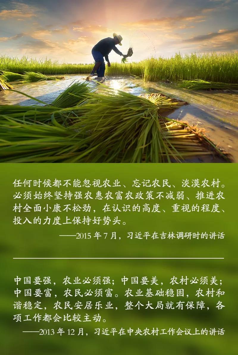 习近平指出,春种秋收,天道酬勤。农业根基稳,发展底气足。“三农”领域的成就,是全党全国上下共同努力的结果,也是广大农民和农业战线工作者辛勤劳作的结果。在此,向全国广大农民和工作在“三农”一线的同志们表示诚挚的问候。