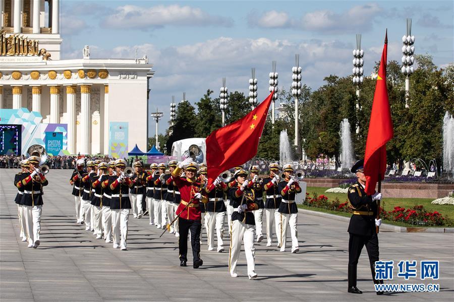 2019年8月24日,在俄罗斯首都莫斯科,参加俄罗斯“救世主塔楼”国际军乐节的中国人民解放军军乐团为莫斯科市民进行巡游演出。新华社记者 白雪骐 摄