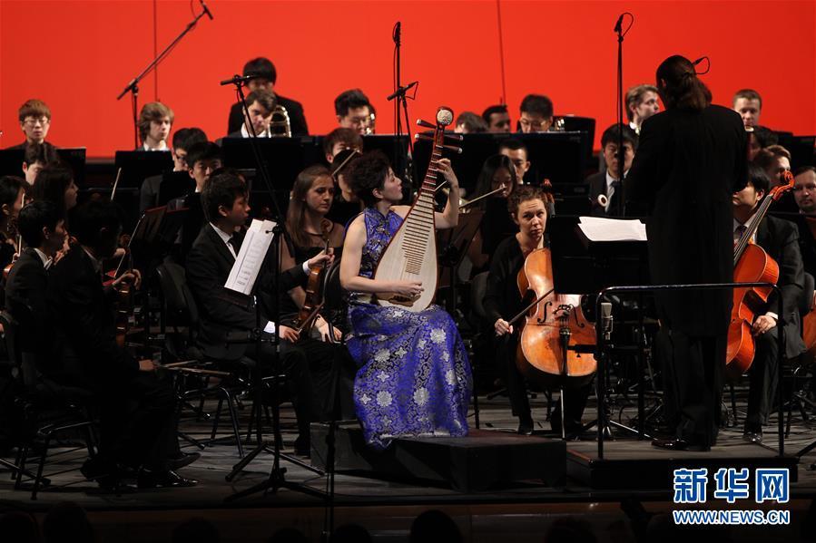 2014年3月28日,“中俄青年友好交流年”开幕式在俄罗斯圣彼得堡隆重举行。这是中国青年演员当日在圣彼得堡马林斯基剧院新舞台演奏中国民族乐器。新华社记者 鲁金博 摄