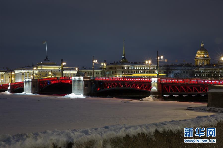 2019年2月5日,俄罗斯圣彼得堡涅瓦河上的宫廷桥点亮红色灯饰,迎接中国农历新年。新华社发(莫京娜摄)