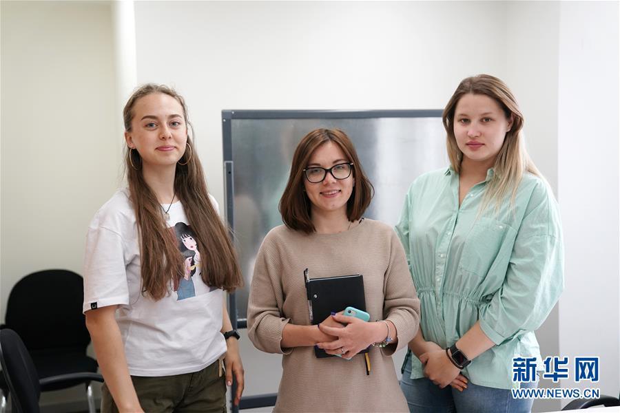 2019年4月18日,来自俄罗斯的留学生傅嘉烨(中)、莉莎(左)和郑筱涵在北京中关村的“一带一路”产业促进会的办公室内。新华社记者 鞠焕宗 摄