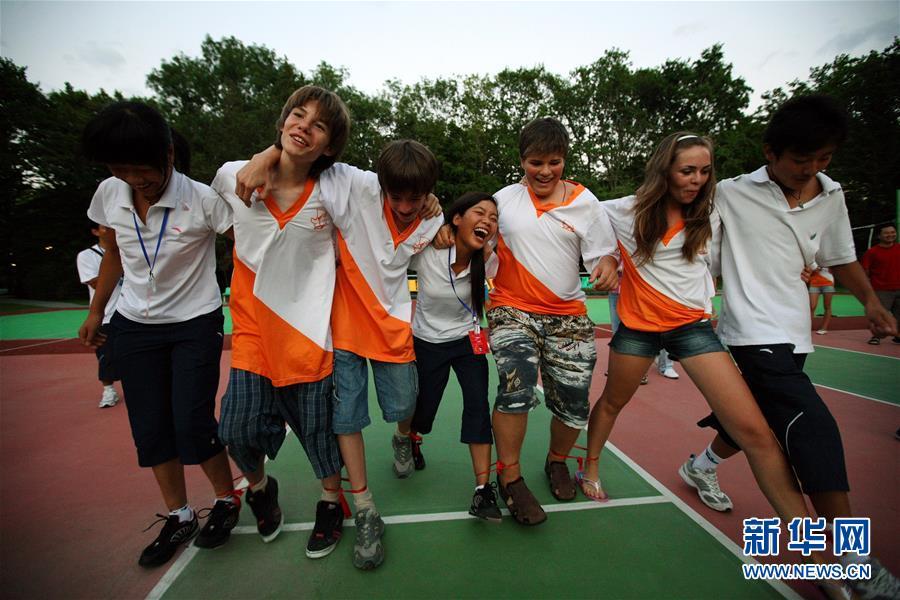 这是2008年8月2日,在俄罗斯南部黑海之滨的“小鹰”全俄儿童中心,在此疗养的中国四川地震灾区的孩子们与俄罗斯学生一起做游戏。新华社记者 沈伯韩 摄