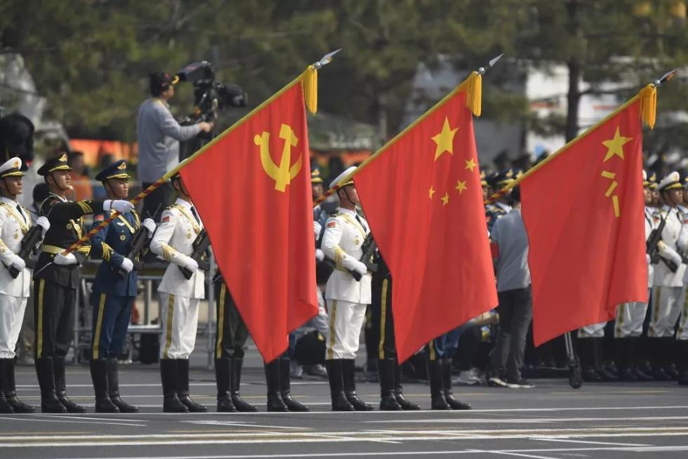 天安门广场上,党旗、国旗、军旗迎风飘展。