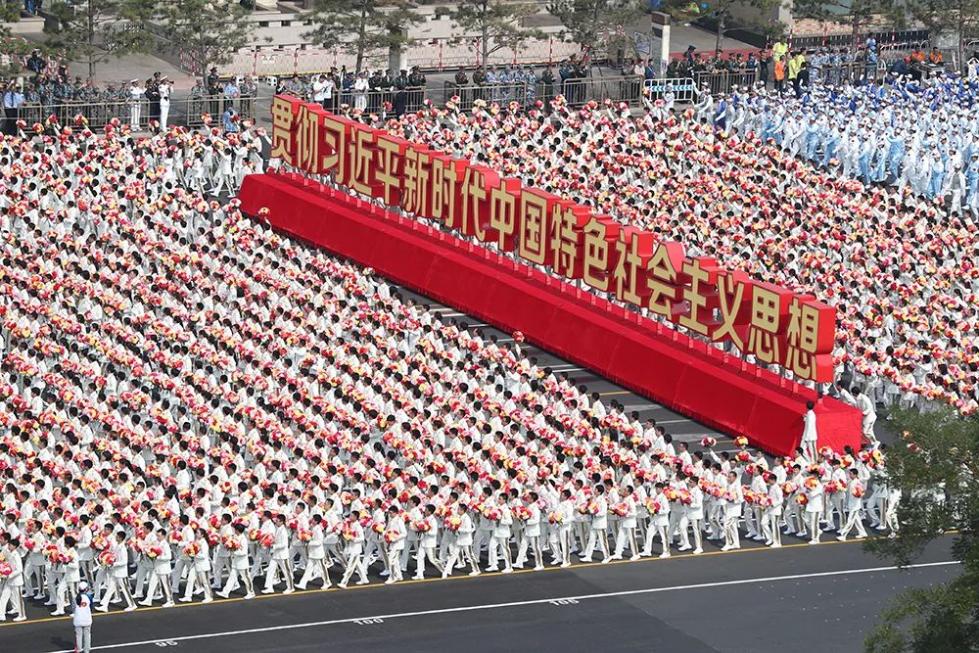 习近平总书记驱车行进至受阅部队最前方,面向旗帜行注目礼。