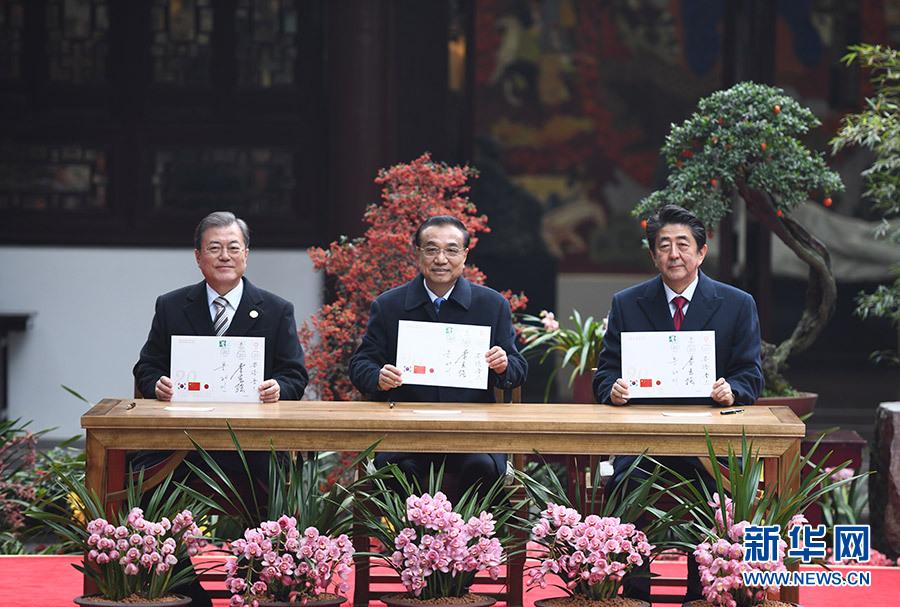 这是三国领导人共同出席“中日韩合作20周年纪念封”发行仪式。 新华社记者 张领 摄