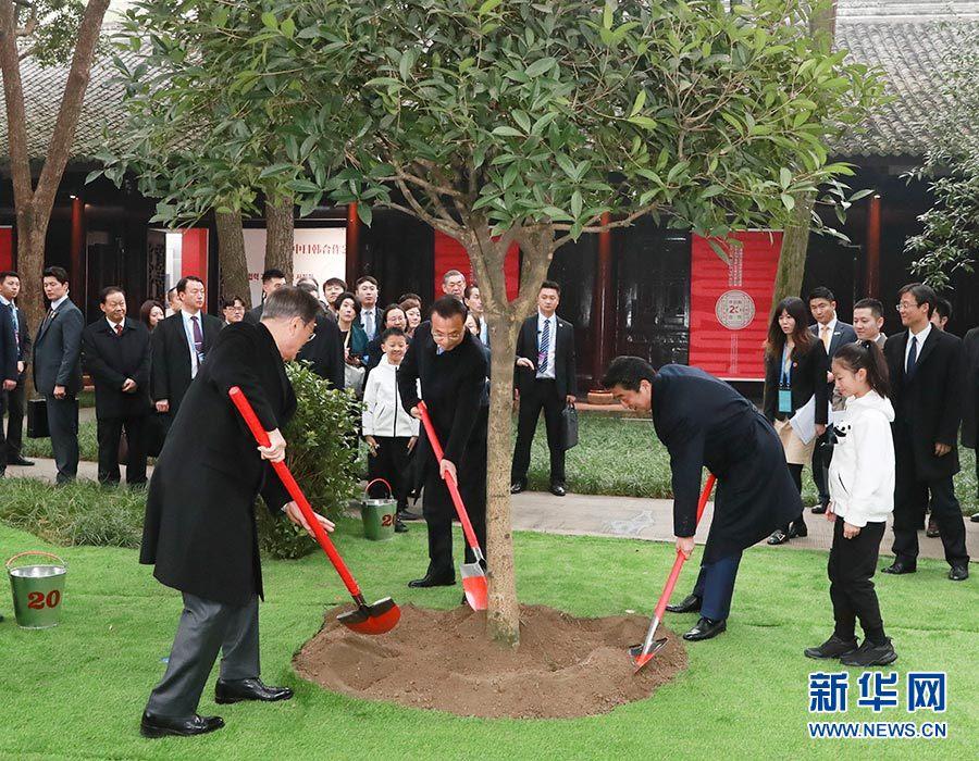 在参观纪念中日韩合作20周年图片展后,三国领导人共同种下一棵桂花树,一起为它培土、浇水。
